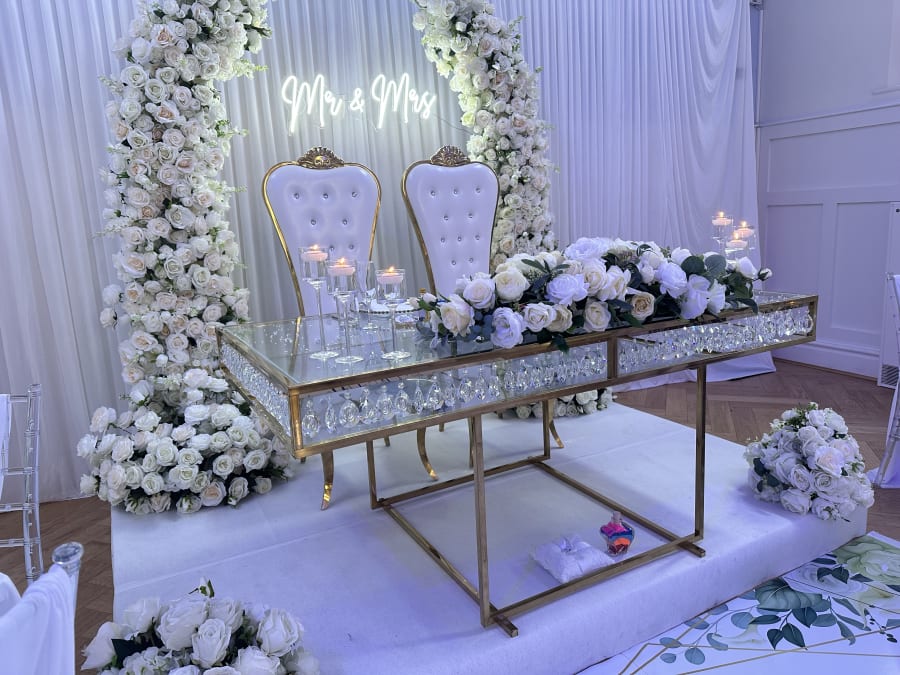Gold metal finish, elegant wedding chairs with white leather.
