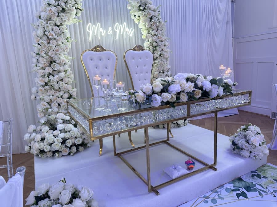 Gold and glass, elegant wedding sweetheart table.