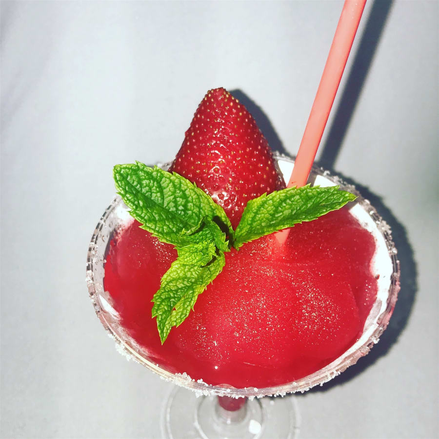cocktail glass, mini cocktail straws, strawberries/lime, mint leaf, salted rim.